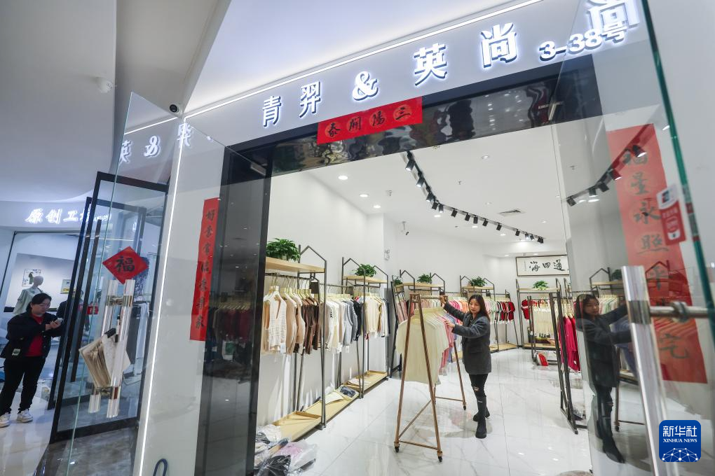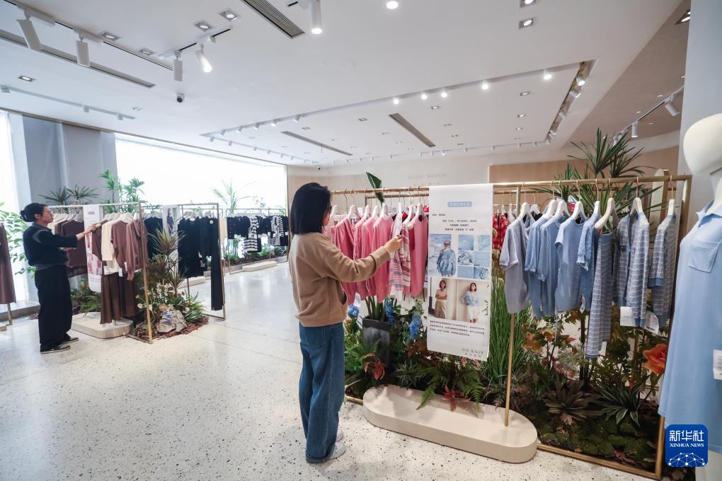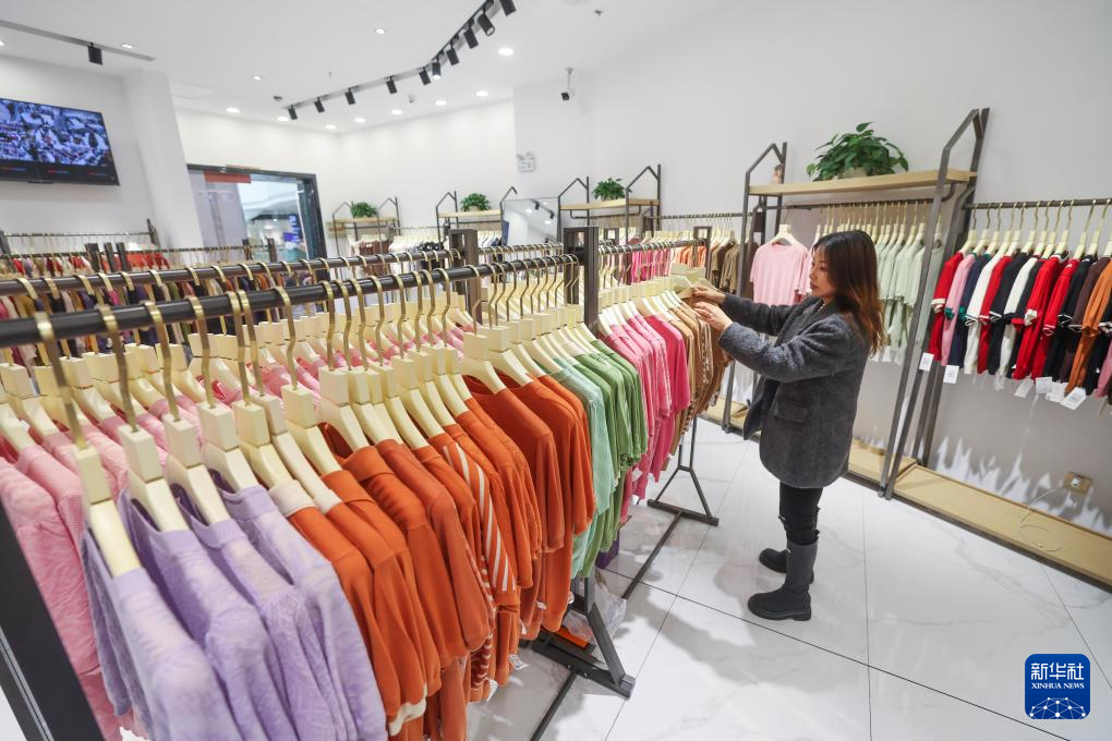 这是濮院羊毛衫市场的时尚中心,客户在挑选新款毛衫(4月9日摄)。