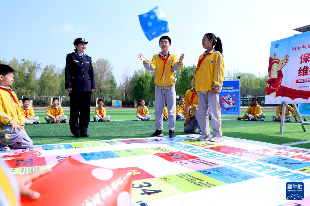 4月12日,在山东省聊城市茌平区第二实验小学,学生在民警的指导下参与国家安全主题的飞行棋闯关比赛。