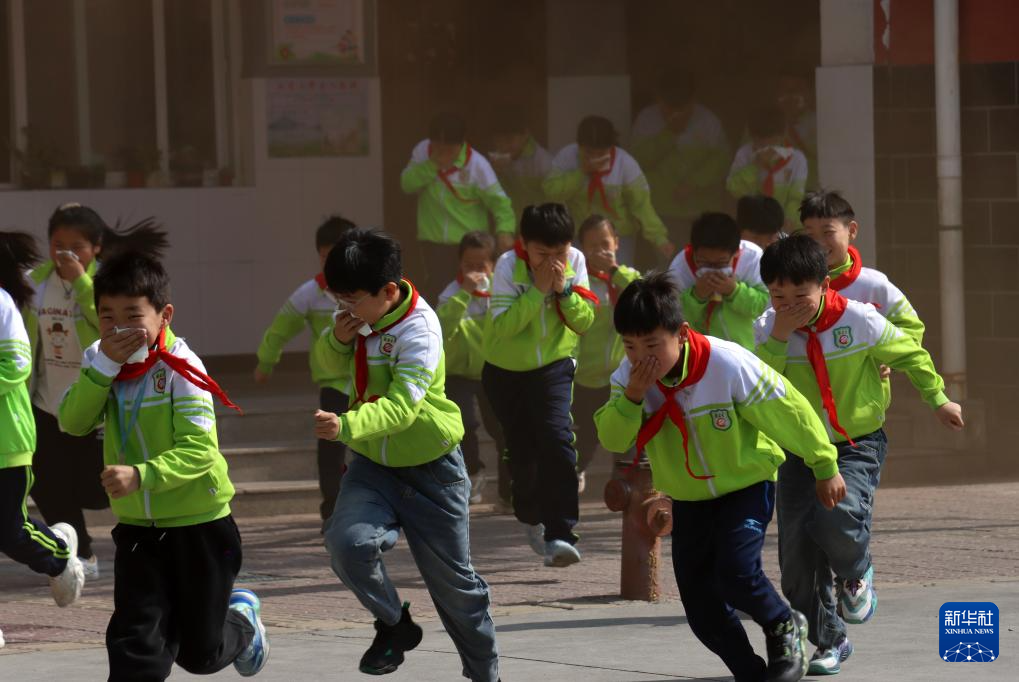 4月12日,河南省安阳市内黄县第七实验小学学生在进行火灾逃生演练。