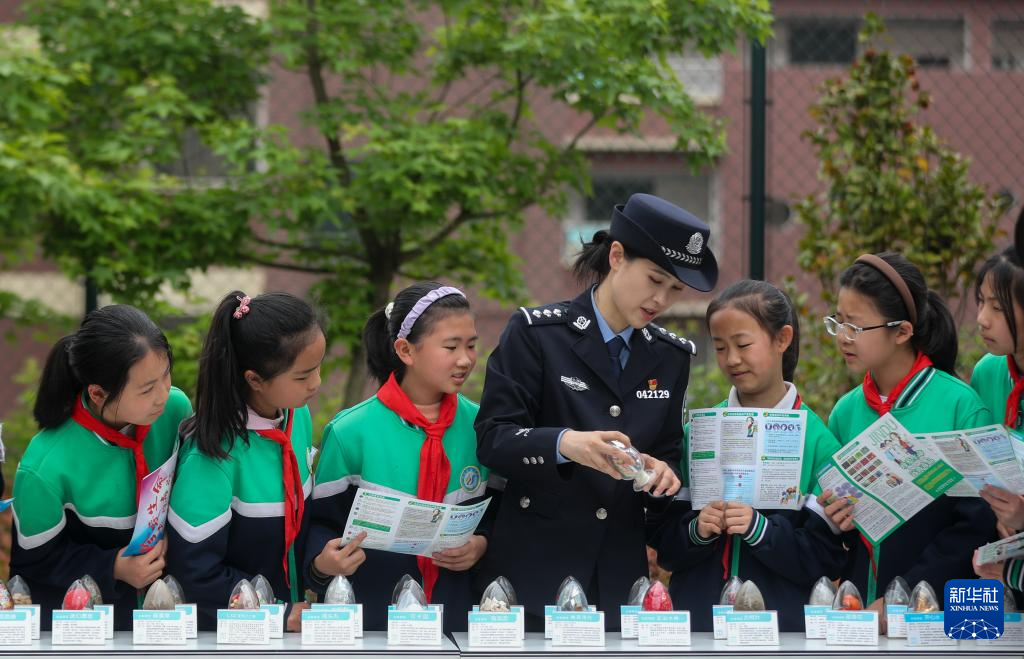 4月12日,民警在贵州省贵阳市乌当区实验小学禁毒园地为学生讲解禁毒知识。