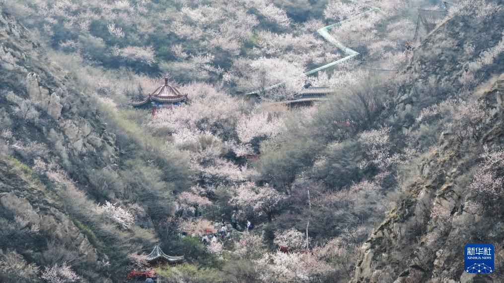 4月13日,游客在河北省张家口市下花园区鸡鸣山登山赏花(无人机照片)。