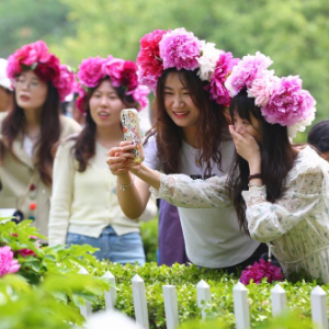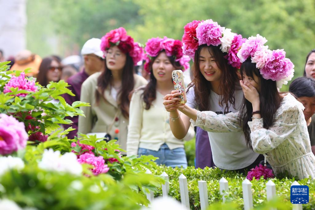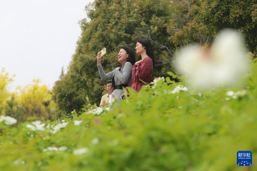 4月13日,游客在山东省菏泽市曹州牡丹园赏花拍照。