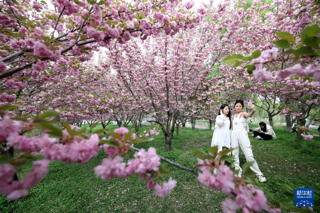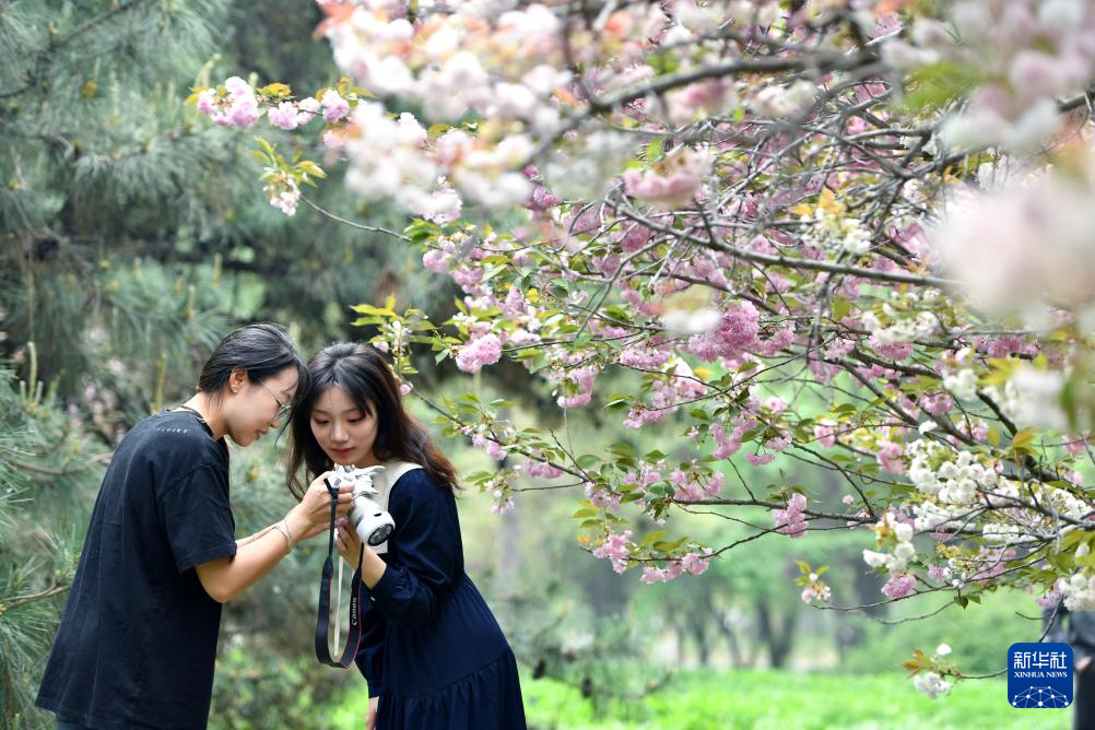 4月13日,河北科技大学的学生在校园内赏花拍照。