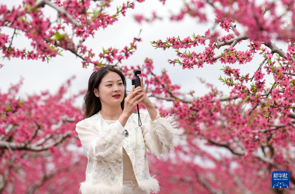 4月13日,游客在山东省胶州市胶北街道前寨村的桃园里拍摄美景。