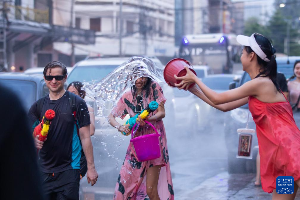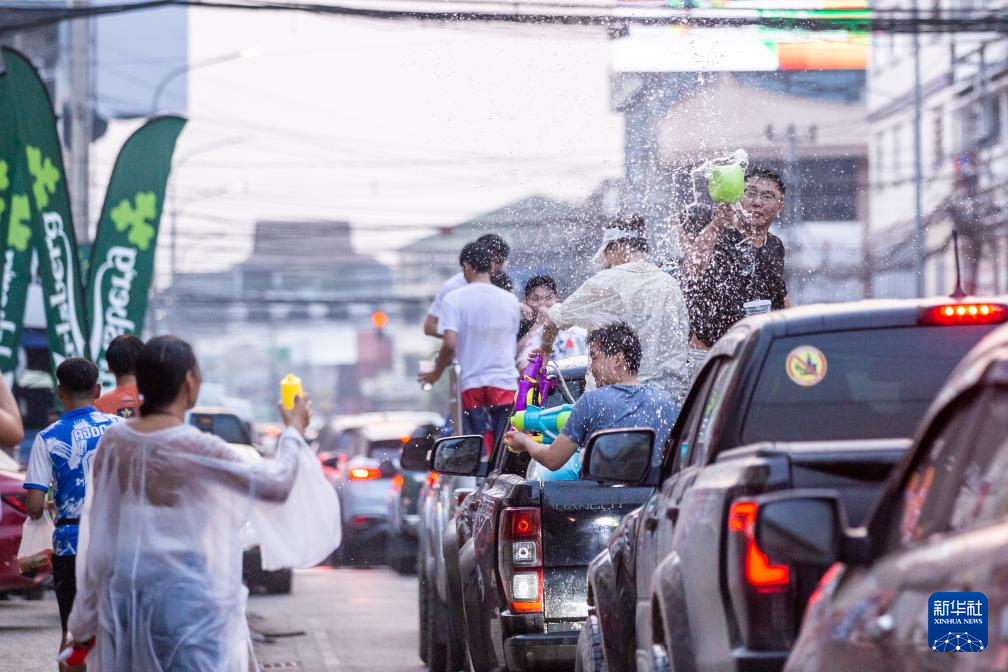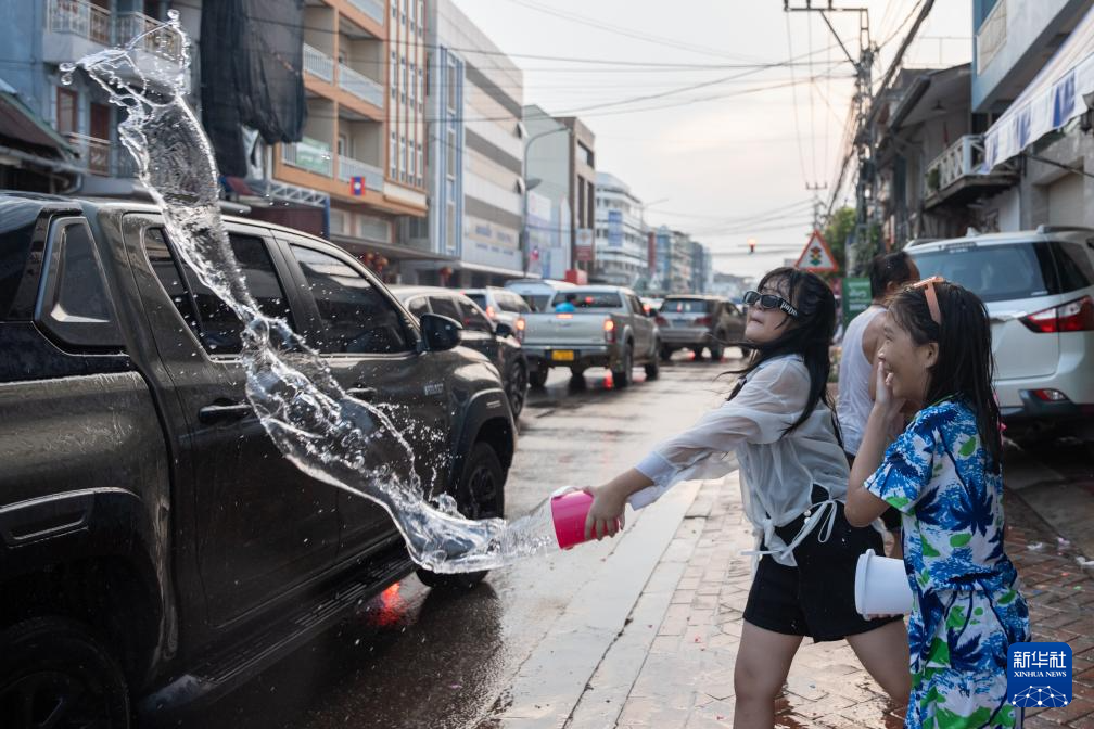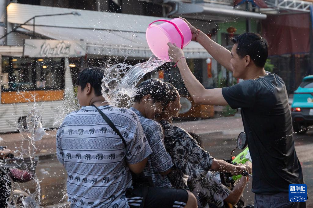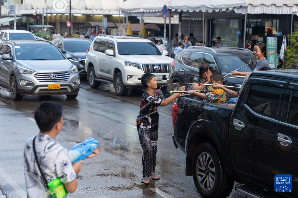4月13日,在老挝首都万象,人们在街头参加泼水节庆祝活动。