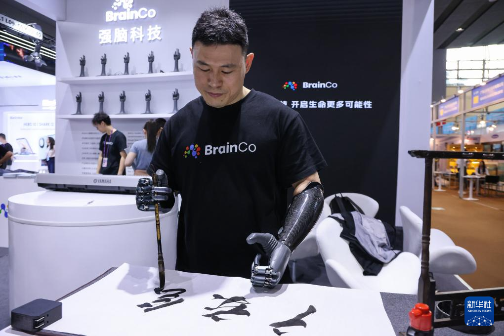 4月15日,强脑科技员工倪敏成在第135届广交会上展示智能仿生手。失去双前肢的倪敏佩戴智能仿生手后,生活能够自理,还能写书法。本次广交会上,浙江强脑科技有限公司带来智能仿生手、仿生腿等脑机接口前沿科技产品,智能仿生手通过佩戴者的神经电和肌肉电信号,实现脑与设备的信息交换,识别佩戴者的运动意图,将其转化为准确动作。
