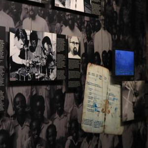 4月8日,在卢旺达基加利的基加利大屠杀纪念馆展厅,一名女子观看记录殖民者强行划分卢旺达人“胡图族”或“图西族”种族身份的展览。