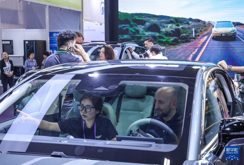 4月15日,采购商在第135届广交会上参观新能源汽车。