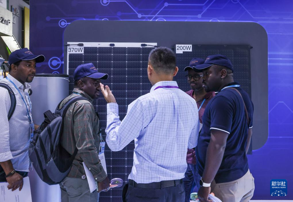 4月15日,境外采购商在第135届广交会上参观太阳能电池展台。