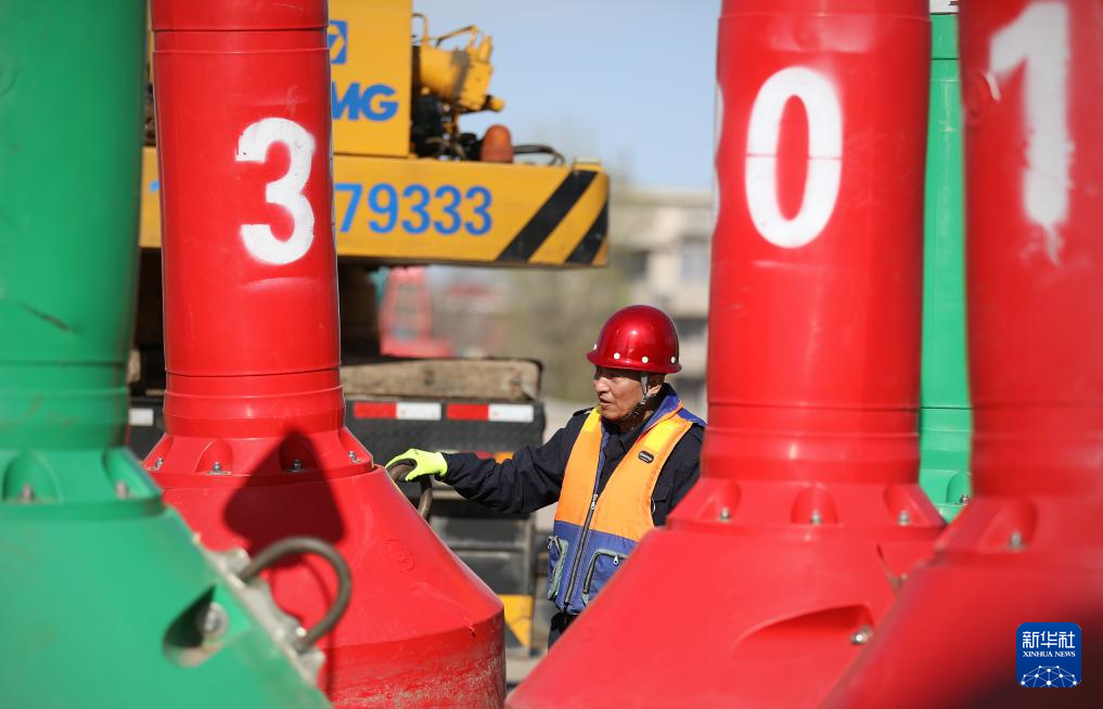 4月17日,王兰平在营口辽河入海口附近的航标堆场码头上检查第二天需要放置的航标。