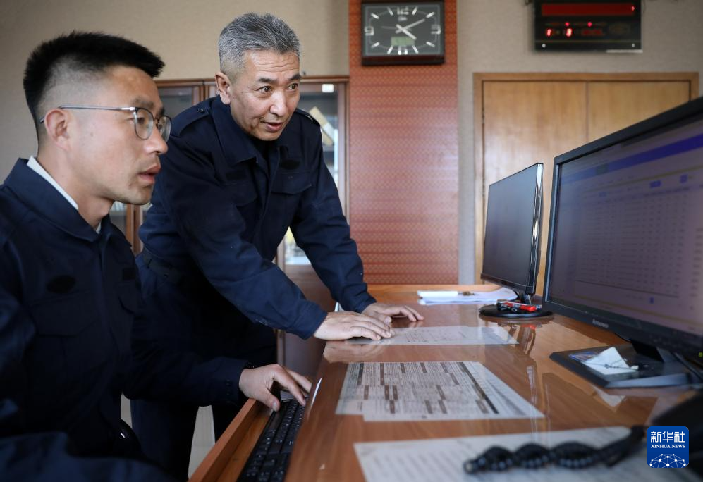 4月17日作业结束回到办公室后,王兰平(右)在监控室查看刚放置航标的参数。 新华社记者 姚剑锋 摄