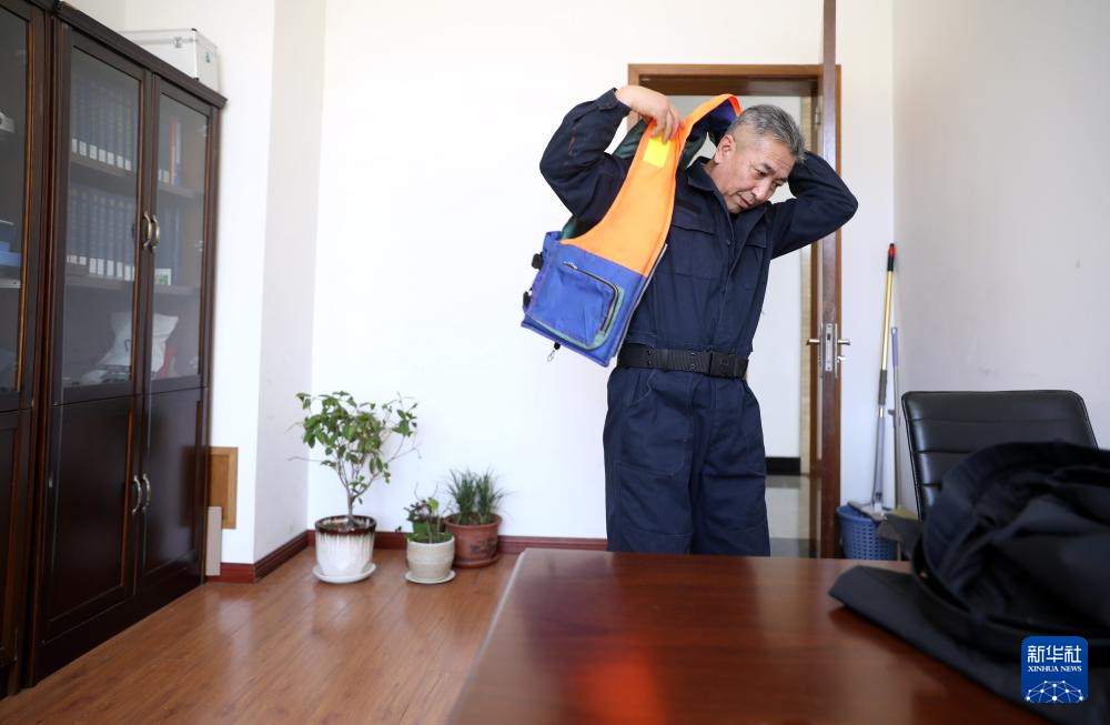 4月17日,换标作业前,王兰平在办公室穿上救生衣。 新华社记者 姚剑锋 摄