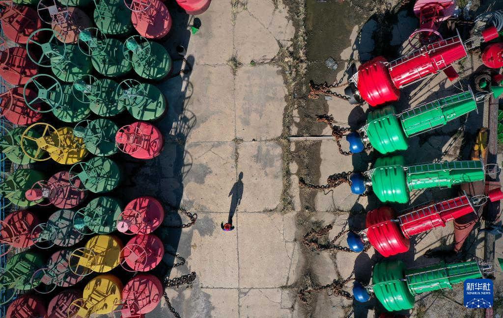 4月17日,王兰平走在营口辽河入海口附近的航标堆场内(无人机照片)。 新华社记者 姚剑锋 摄