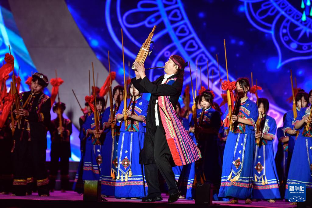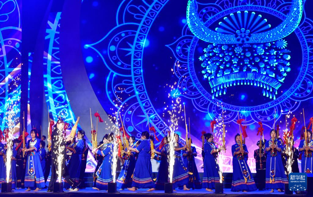 4月20日晚,演员在2024年贵州台江苗族姊妹节开幕式上吹奏芦笙。