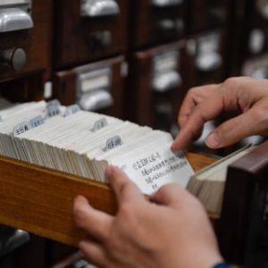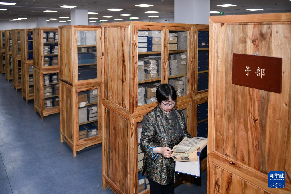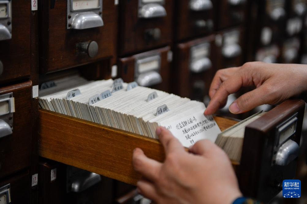 吉林大学图书馆古籍部主任王丽华在线装书库内翻看分类目录寻找古籍(4月19日摄)。