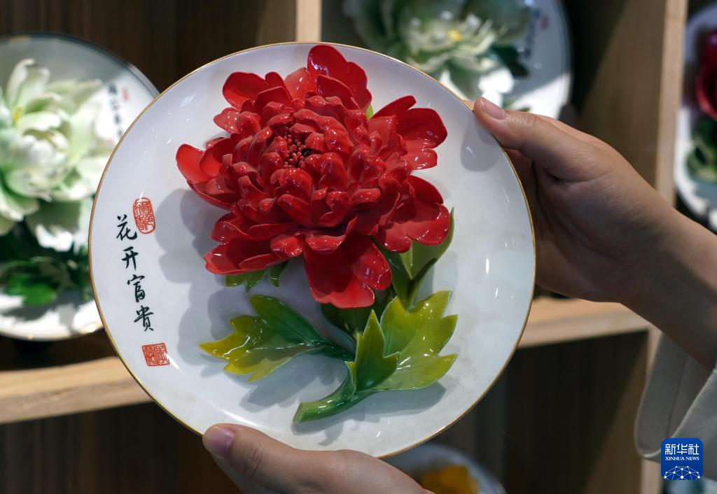 4月16日,在洛阳牡丹阁拍摄的牡丹瓷纪念品。