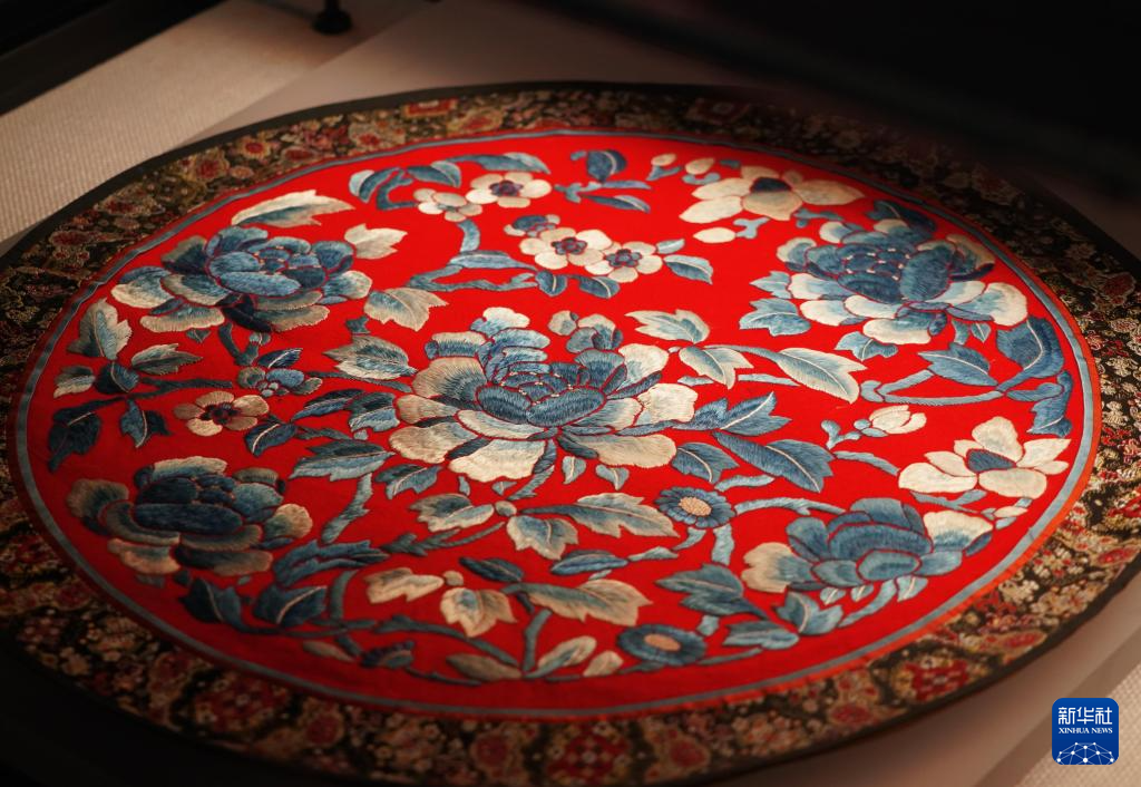 4月16日,在洛阳牡丹阁拍摄的带有牡丹元素的展品“平安富贵绣片”。