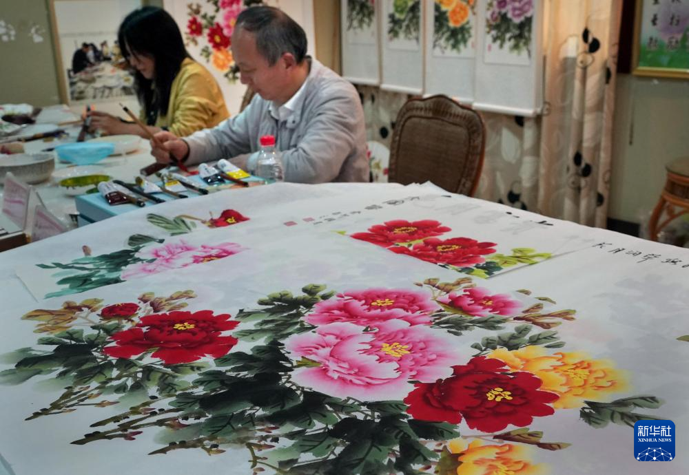 4月16日,画师在河南省洛阳市国家牡丹园内进行牡丹画创作。