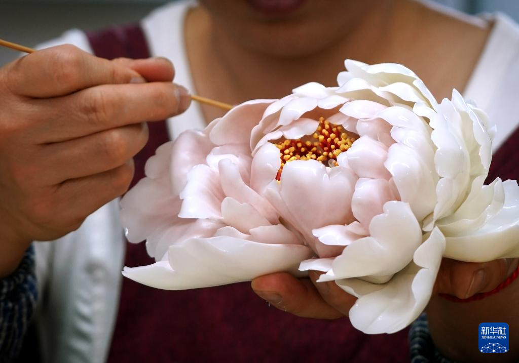4月17日,洛阳牡丹瓷博物馆的工作人员在制作牡丹瓷。