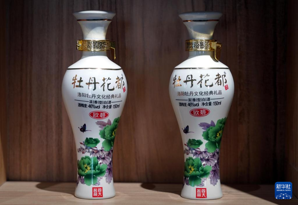 4月16日,在洛阳牡丹阁拍摄的带有牡丹元素的酒产品。