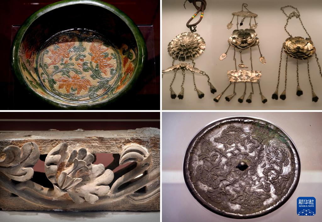 拼版照片:4月16日在洛阳牡丹阁拍摄的三彩牡丹纹大盆(左上)、牡丹银饰(右上)、房脊砖雕(左下)、牡丹纹铜镜(右下)。