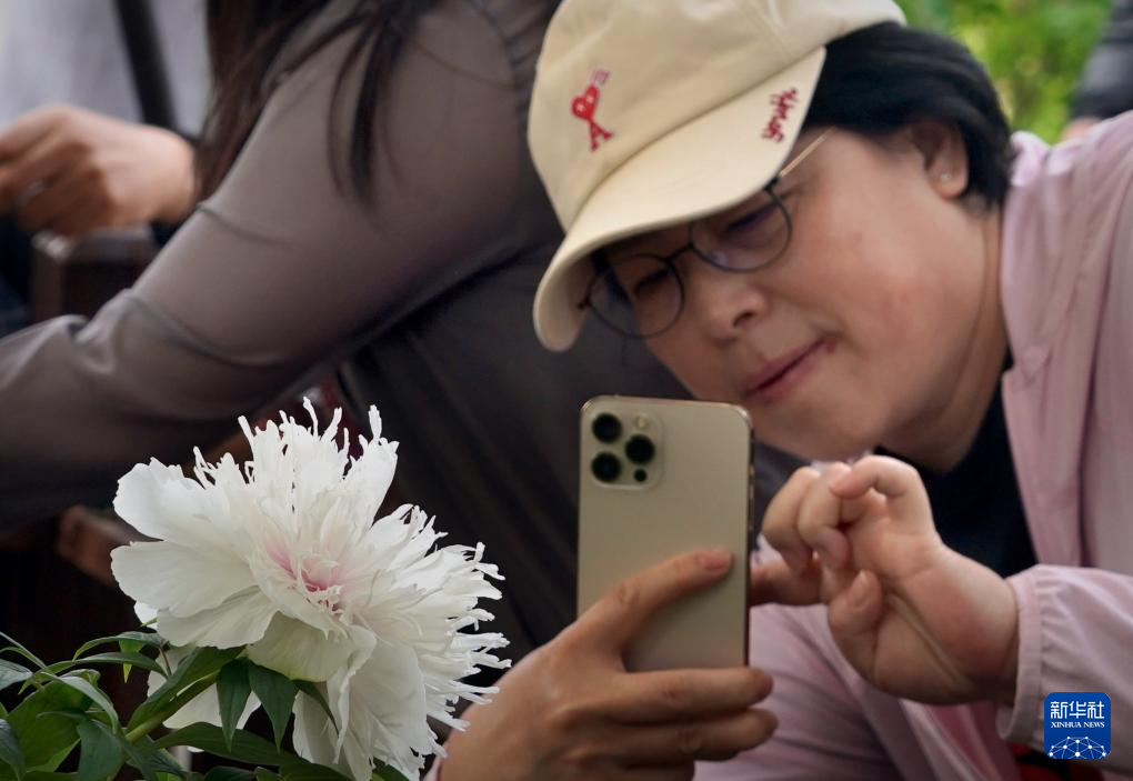 4月17日,游客在河南省洛阳市隋唐城遗址植物园拍摄牡丹晚开品种“银丝贯顶”。