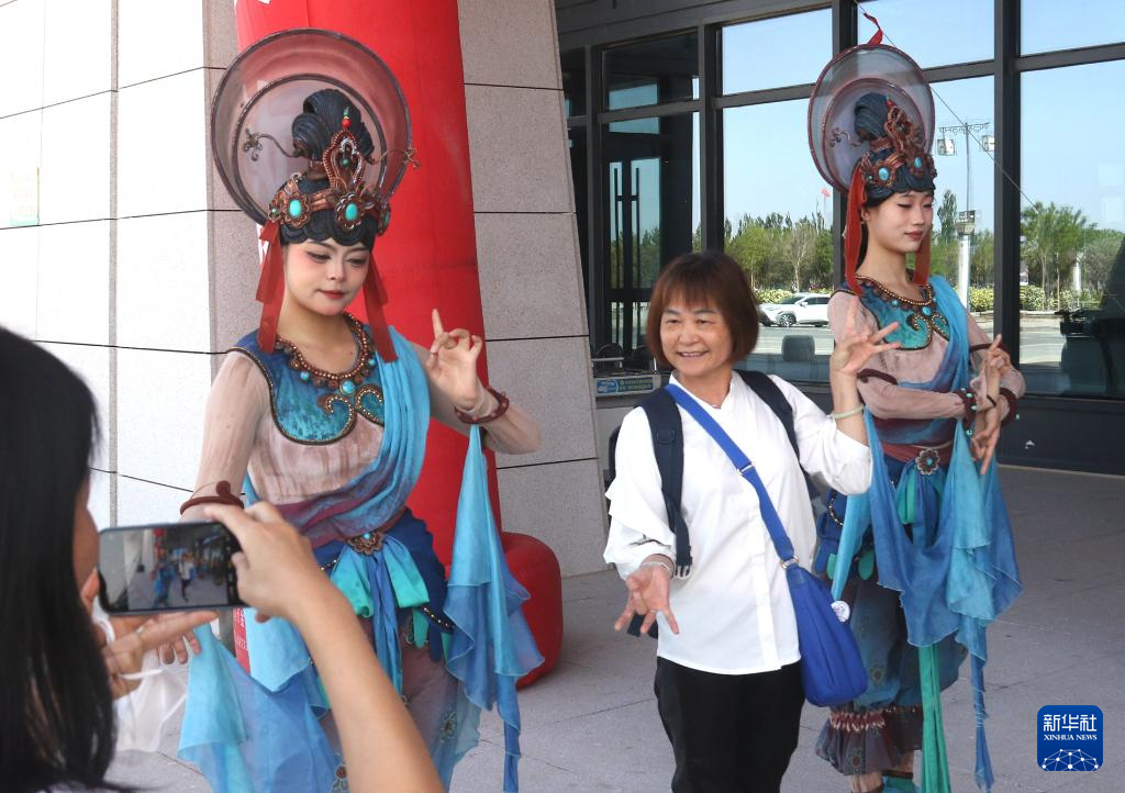 4月22日,游客在甘肃敦煌莫高国际机场航站楼前与身着飞天服饰的迎宾礼仪人员合影。