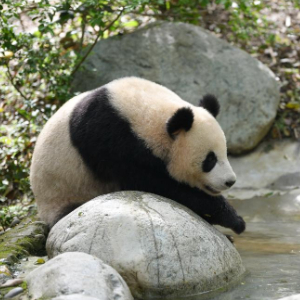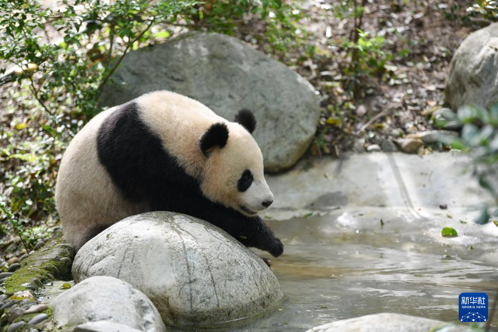 4月21日,在成都大熊猫繁育研究基地,大熊猫“梦想”在水池边休息。大熊猫“梦想”“梦圆”,均为雄性,2019年9月1日出生于德国柏林动物园,目前在成都大熊猫繁育研究基地。