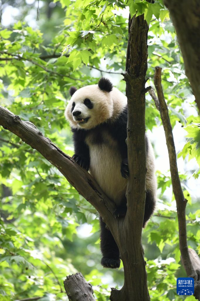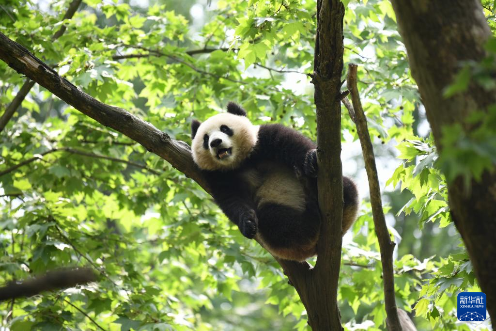4月19日,在中国大熊猫保护研究中心都江堰基地,大熊猫“叻叻”在树上休息。大熊猫“叻叻”,雄性,2021年8月14日出生于新加坡河川生态园,目前在中国大熊猫保护研究中心都江堰基地。
