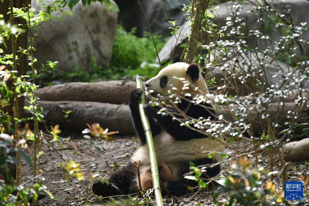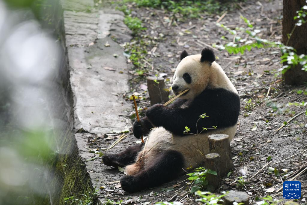 4月19日,在中国大熊猫保护研究中心都江堰基地,大熊猫“叻叻”在吃竹子。大熊猫“叻叻”,雄性,2021年8月14日出生于新加坡河川生态园,目前在中国大熊猫保护研究中心都江堰基地。