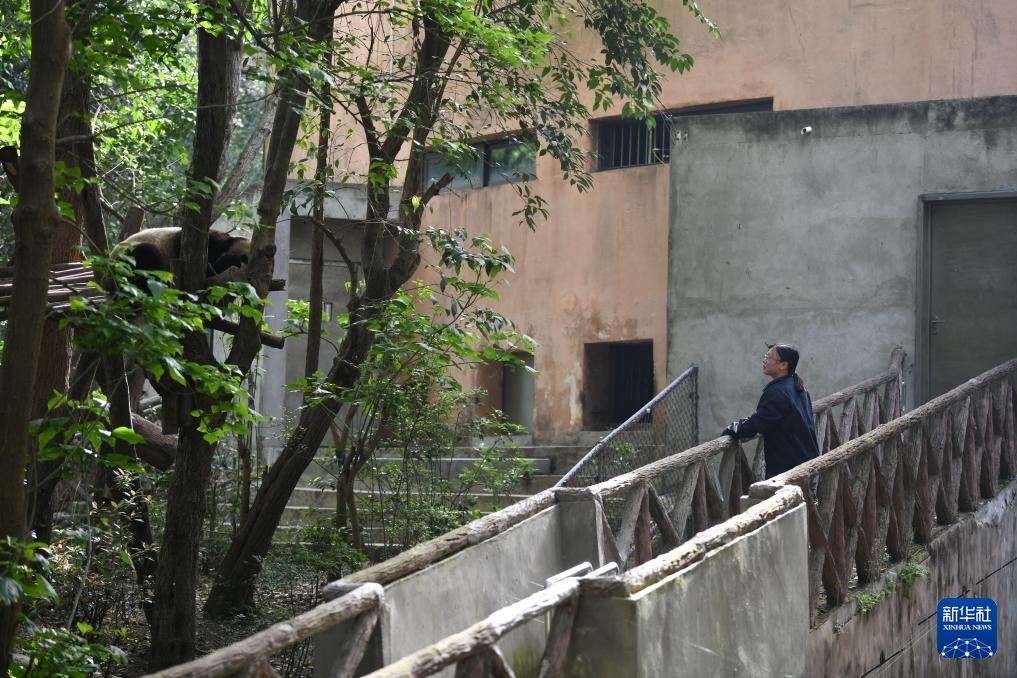 4月21日,在成都大熊猫繁育研究基地,饲养员在观察大熊猫“圆梦”情况。大熊猫“圆梦”,雄性,2017年8月4日出生于法国博瓦勒动物园,目前在成都大熊猫繁育研究基地。
