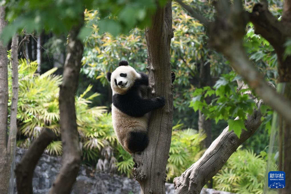 4月19日,在中国大熊猫保护研究中心都江堰基地,大熊猫“叻叻”在爬树。大熊猫“叻叻”,雄性,2021年8月14日出生于新加坡河川生态园,目前在中国大熊猫保护研究中心都江堰基地。