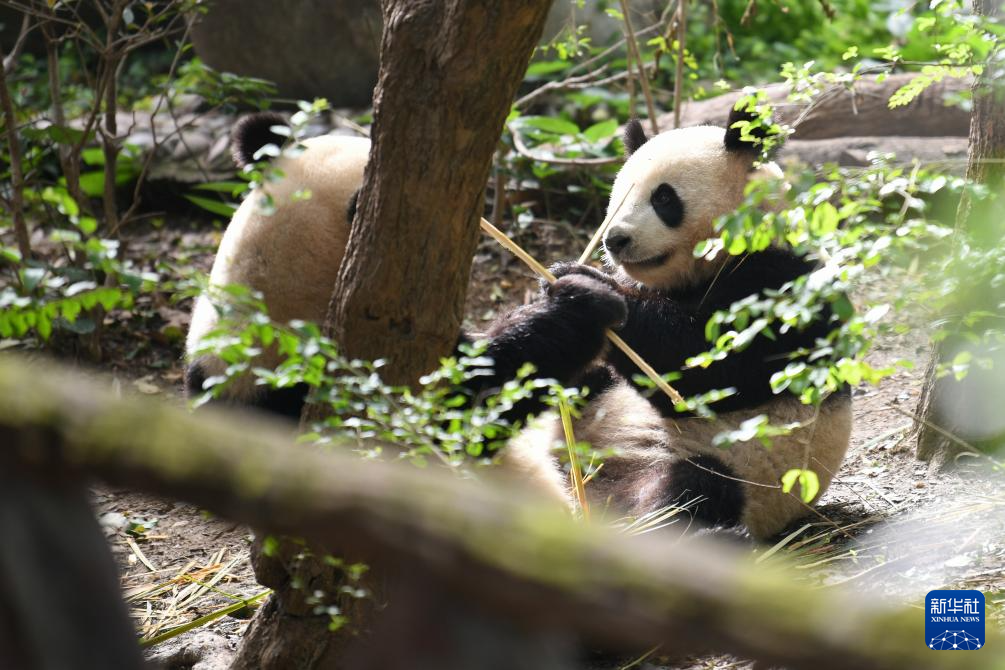 4月21日,在成都大熊猫繁育研究基地,大熊猫“梦圆”(右)在吃竹子。大熊猫“梦想”“梦圆”,均为雄性,2019年9月1日出生于德国柏林动物园,目前在成都大熊猫繁育研究基地。