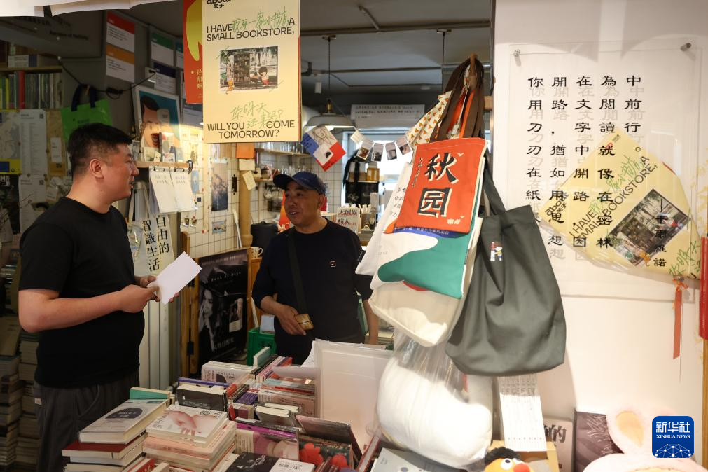 4月23日,潘新泽(左)在门洞里书店与购书的读者交流。