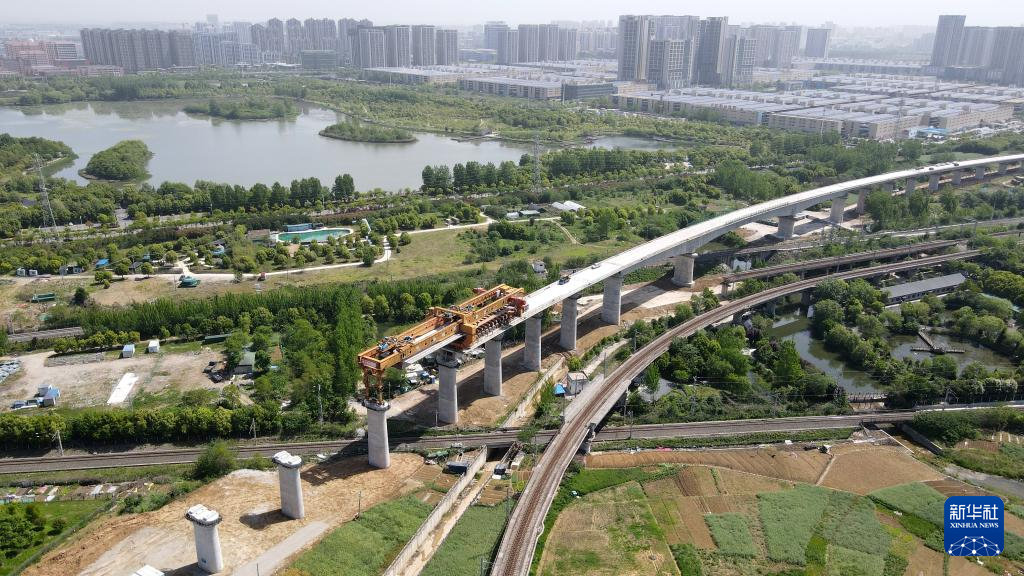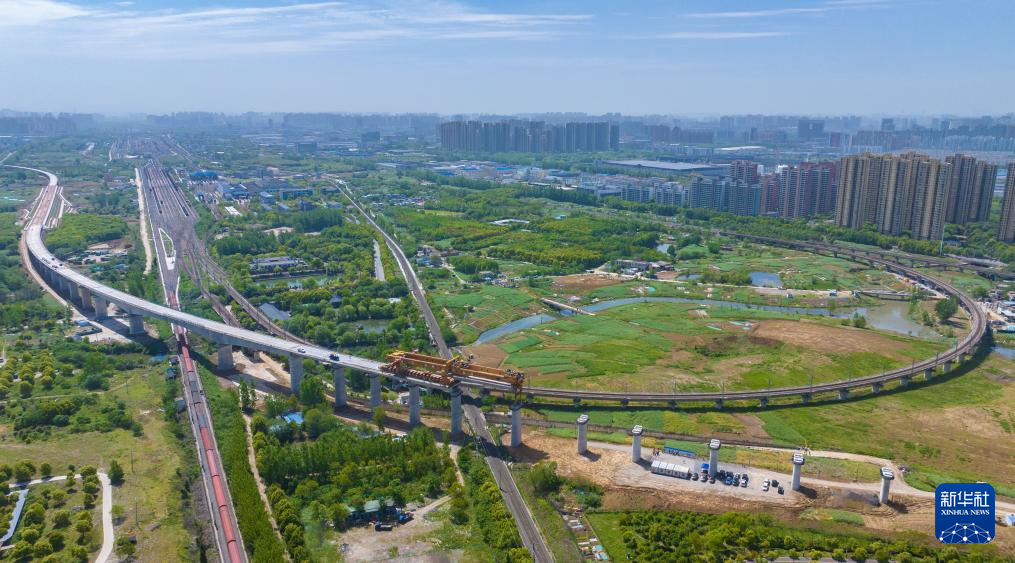 这是合新铁路上跨既有铁路淮南上行线架梁施工现场(4月24日摄,无人机照片)。