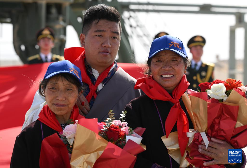 4月24日在中国酒泉卫星发射中心东方红卫星发射塔下拍摄的七一勋章获得者卓嘎(左一)和“时代楷模”央宗(右一)。