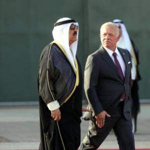 4月23日,在约旦首都安曼,约旦国王阿卜杜拉二世(后右)欢迎到访的科威特埃米尔米沙勒(后左)。