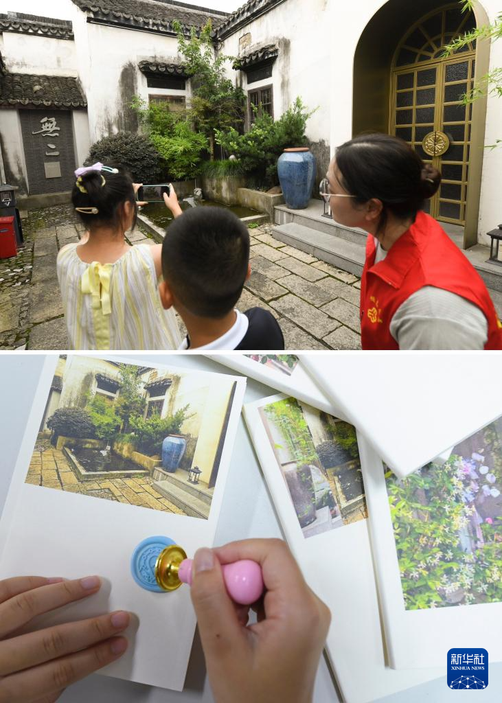 上图为2023年7月19日,参加研学活动的青少年在小西街拍照;下图为2023年7月19日,小西街一家文创店铺将照片制作成笔记本送给青少年。