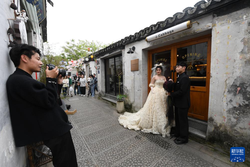 一对新人在小西街拍婚纱照(4月21日摄)。