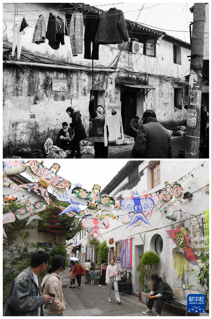 上图为2014年晾晒着衣物的小西街(支江摄);下图为2024年4月21日,人们走过挂满风筝的小西街(新华社记者翁忻旸摄)。