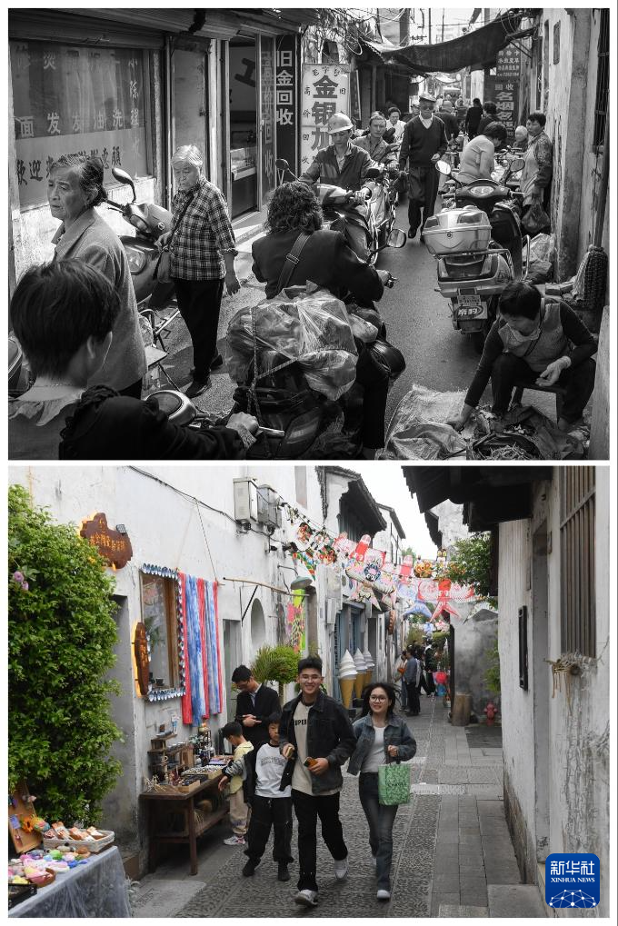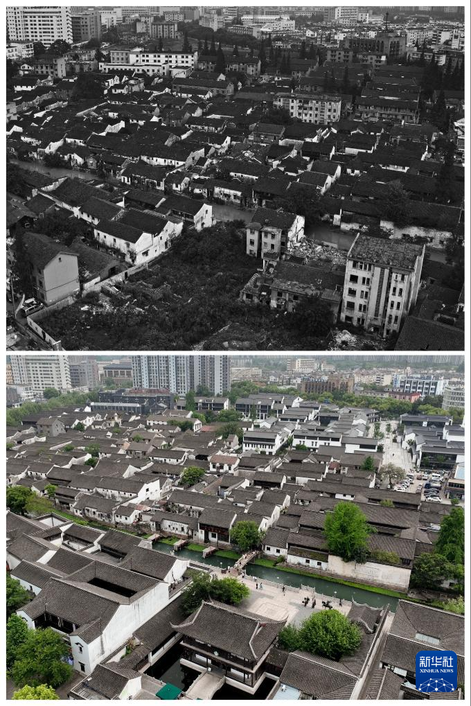 上图为2012年拍摄的浙江湖州小西街(湖州市朝阳街道供图);下图为2024年4月21日拍摄的小西街(新华社记者翁忻旸摄)。
