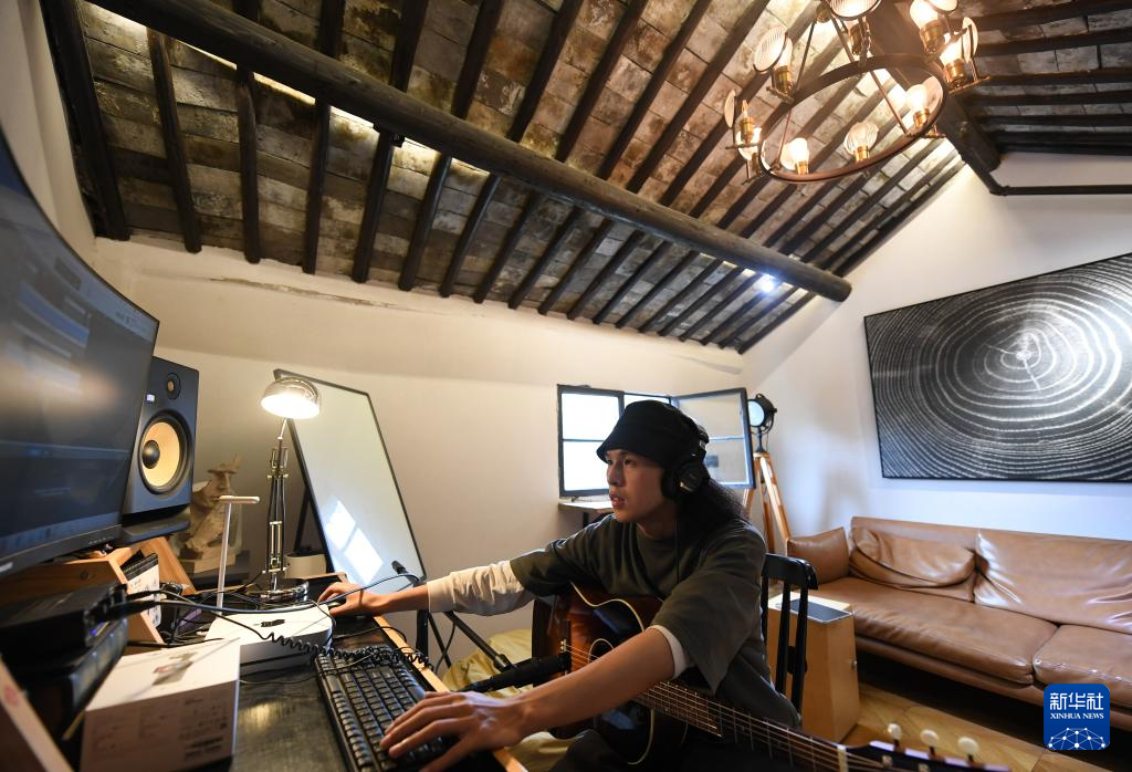 音乐人李小强在自己开设在小西街的音乐工作室编辑音轨(4月21日摄)。