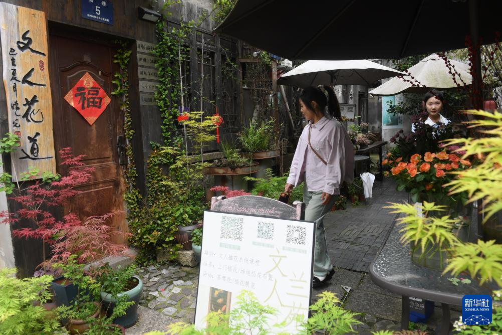 游客参观老湖州人应国宏在小西街自家院落布置的绿植自助售卖点(4月21日摄)。游客可扫码自助购花。