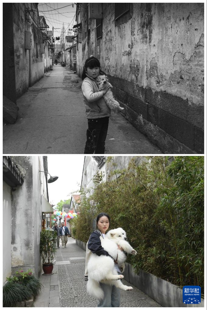 上图为2008年,6岁的陈萍抱着宠物狗“波斯”站在小西街的家门口(肖二摄);下图为2024年4月21日,22岁的陈萍抱着现在的宠物狗“球球”在改成素食店的老家门口留影(新华社记者翁忻旸摄)。