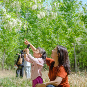 4月25日,游客在枣强县古漳营头村的一处槐林里游玩拍照。