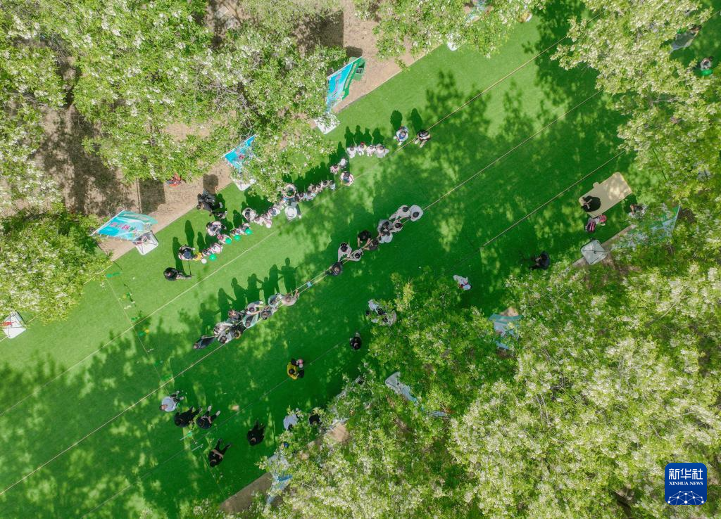 4月25日,游客在枣强县古漳营头村的一处槐林里进行拔河比赛(无人机照片)。