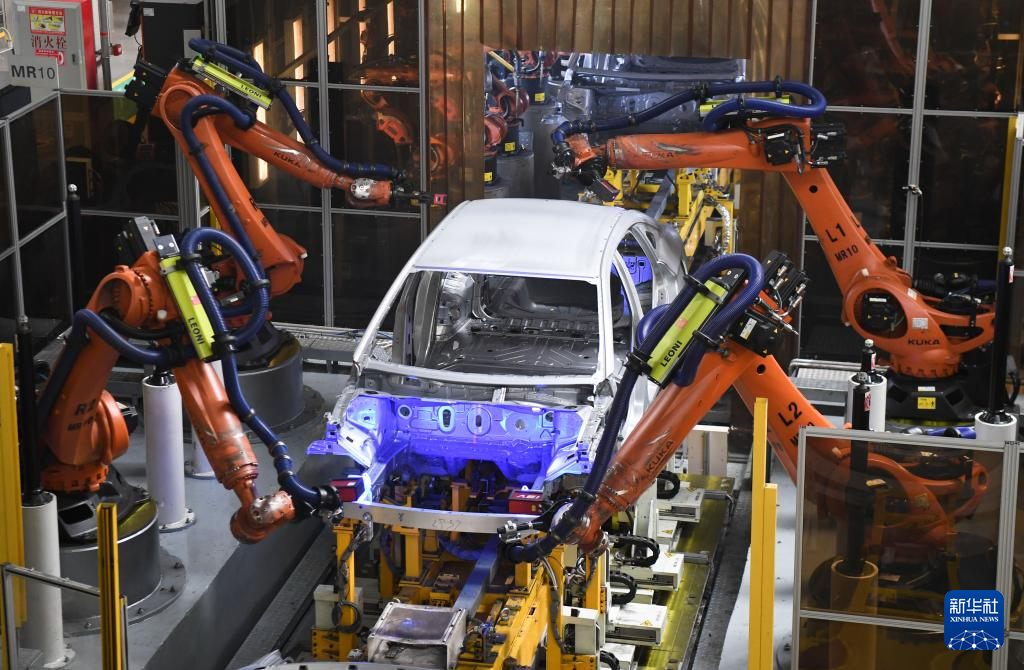 这是4月24日拍摄的广州广汽埃安新能源汽车焊装车间。