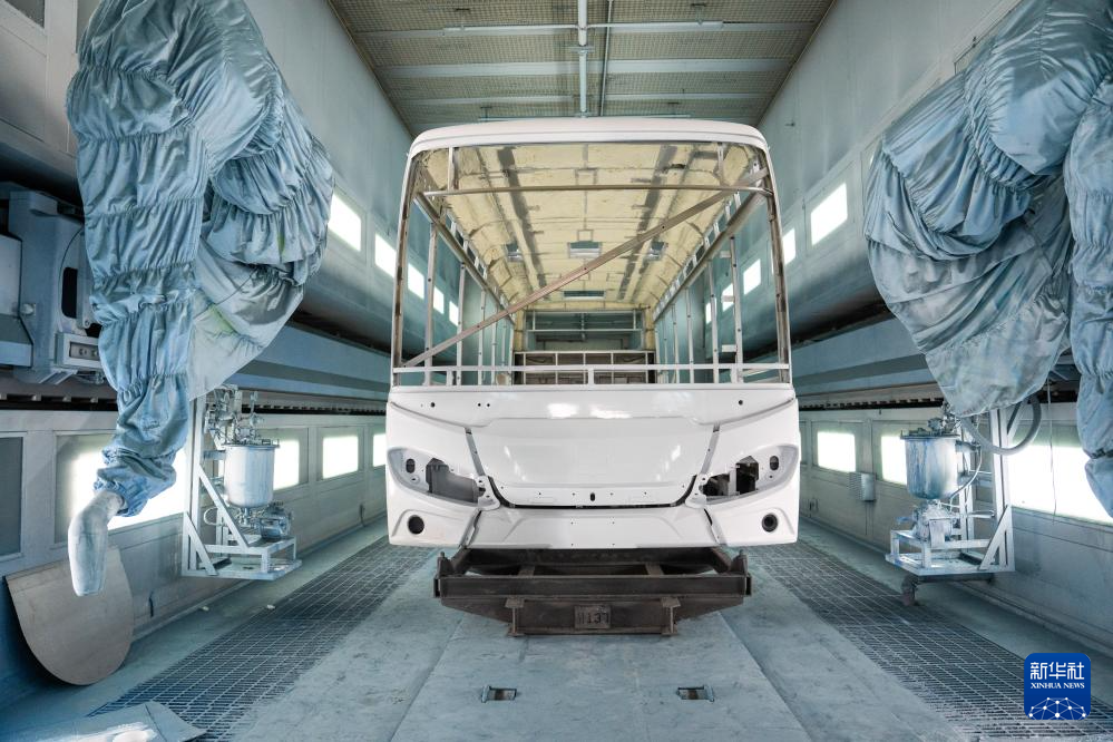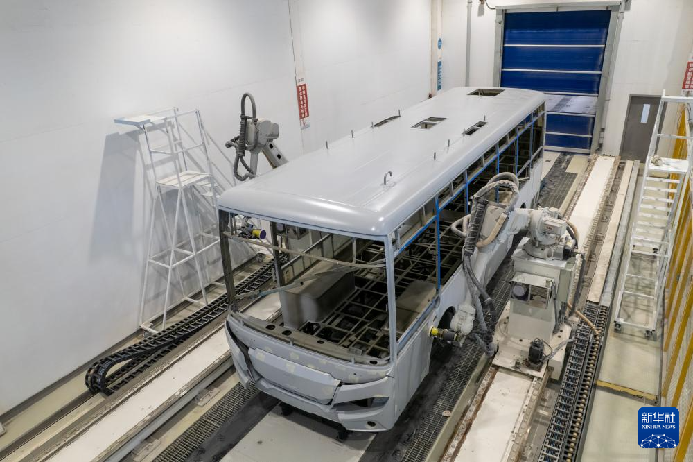 在湖南常德中车新能源汽车有限公司涂装车间,面漆机器人在喷漆(4月25日摄)。