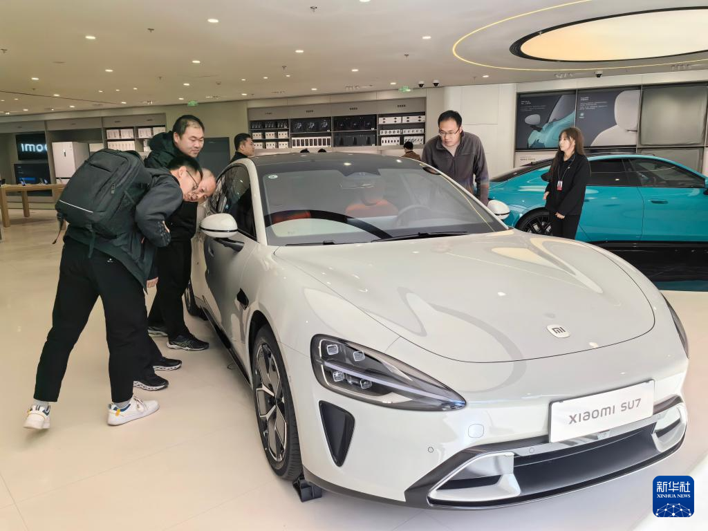 在北京一家小米汽车零售门店内,消费者在了解小米新能源汽车SU7(3月28日摄)。