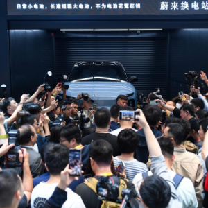 在北京中国国际展览中心顺义馆举行的2024北京车展上,参观者在蔚来汽车展台参观电动汽车换电站演示(4月25日摄)。